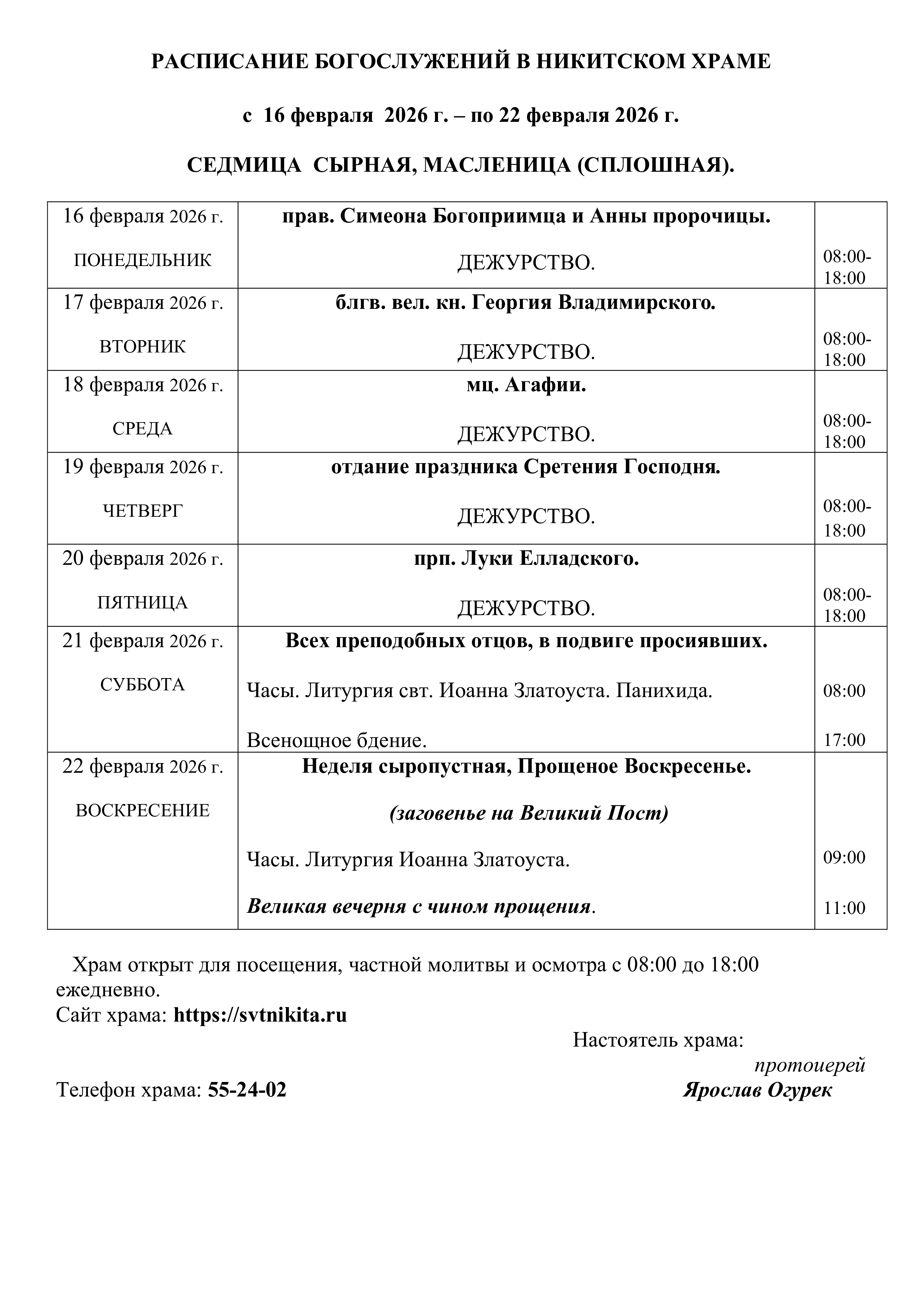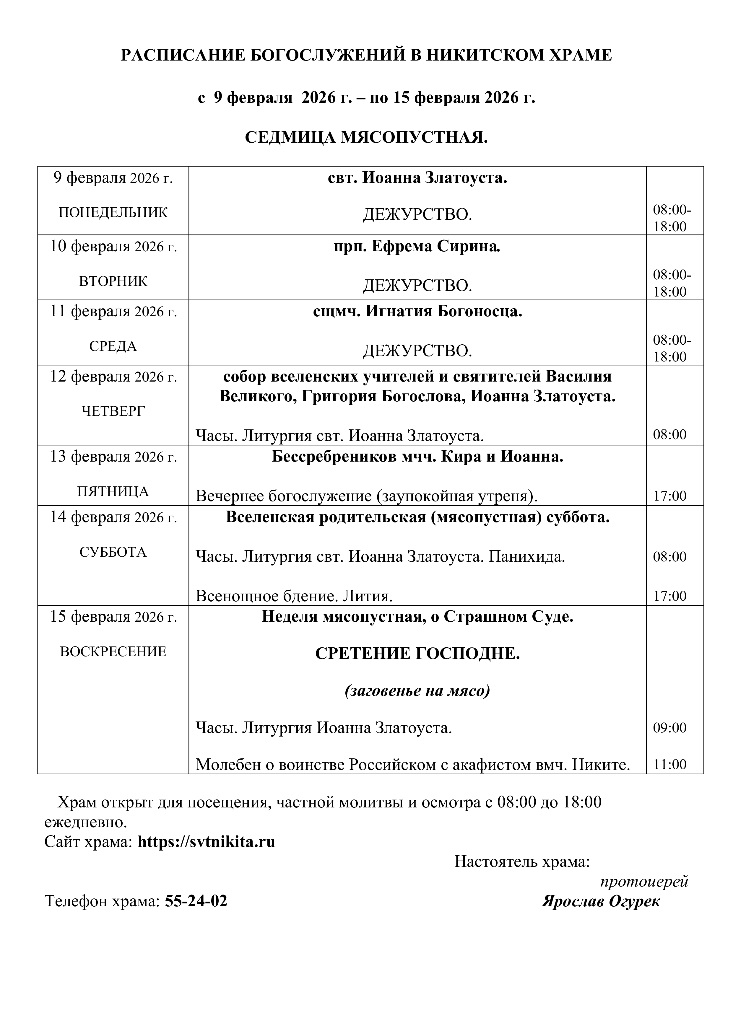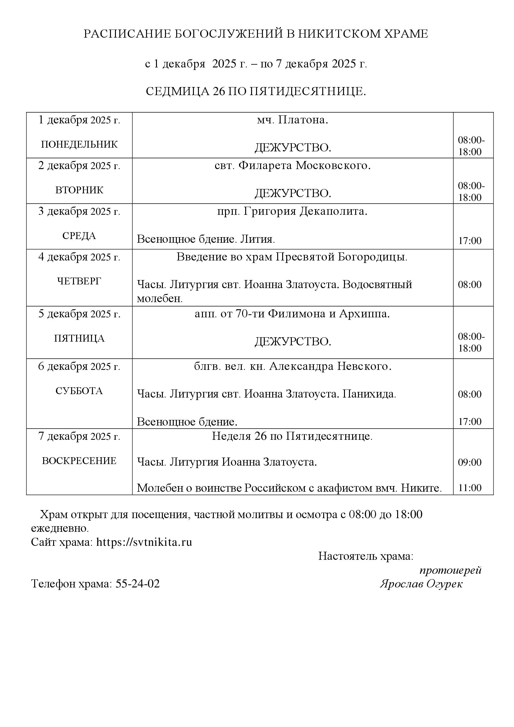 Расписание Богослужений