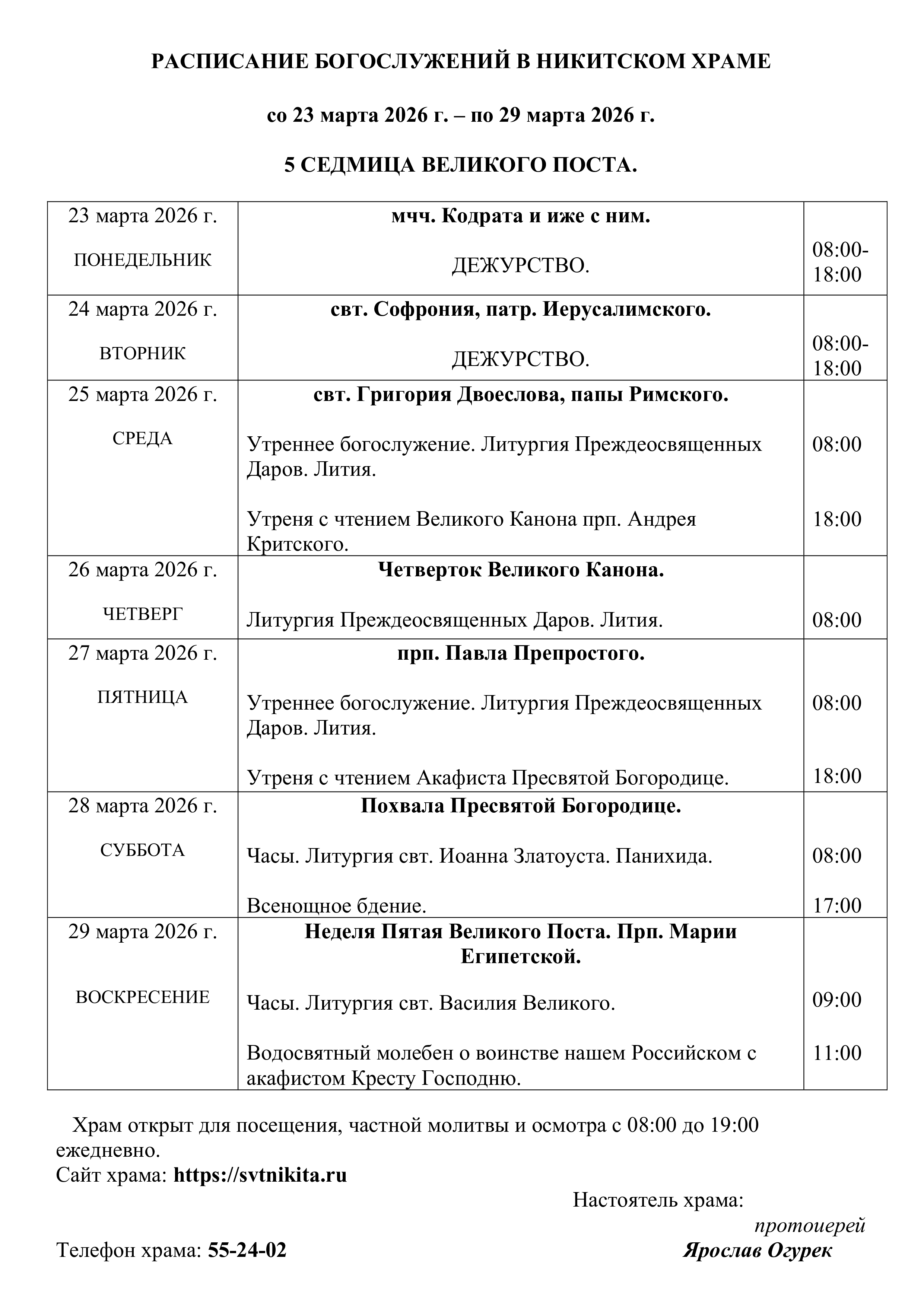 Расписание богослужений